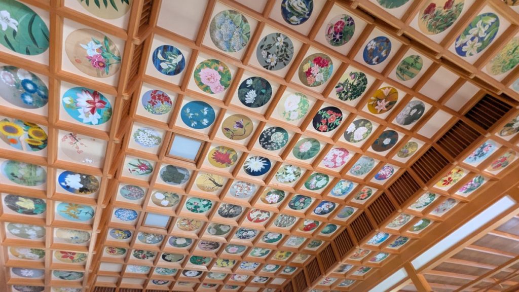 往生院は平成9年に再建された念仏写経研修道場です。天井には花の天井画が描かれていました。