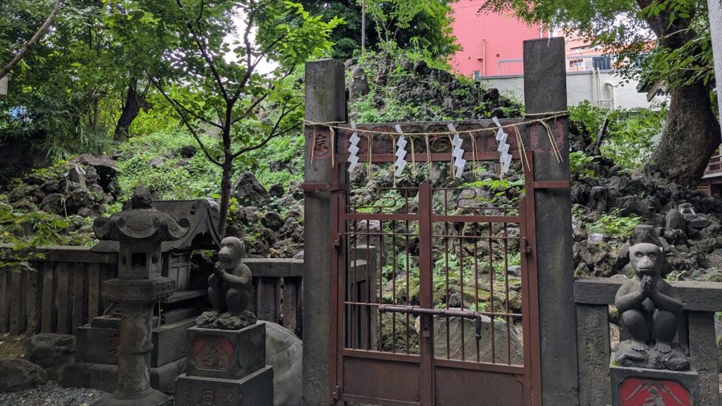 富士塚は「下谷坂本富士」と呼ばれ、天明2年(1782)に築かれました。高さは6メートルあり、富士塚の山肌には富士山から運ばれた溶岩が使われています。