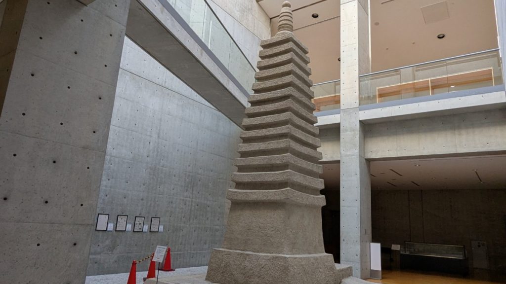 出口の近くにある「鹿谷寺(ろくたんじ)石塔復元模型」の十三重石塔の周りには、小学生が作った考古学新聞が展示されています。