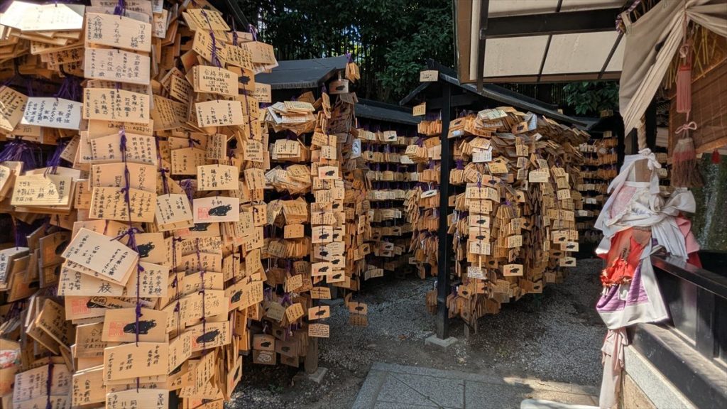 本殿の後方にある牛社にはたくさんの絵馬がかかっていました。牛社におまつりされている臥牛は「一願成就のお牛さま」で、願い事を必ず叶えてくださる牛です。