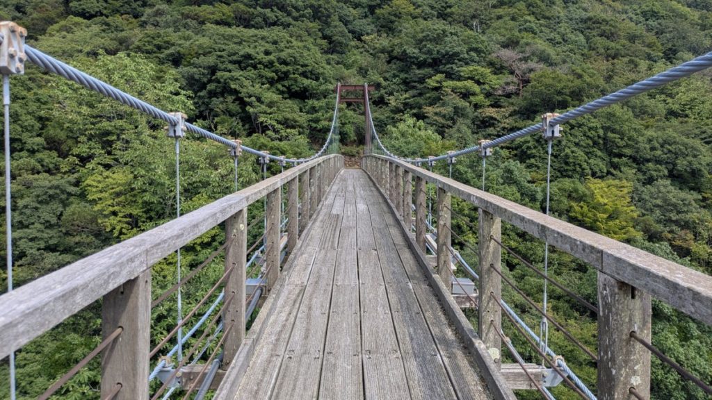 歩くと揺れるし、両側の手すりが低く開放感にあふれています。怖くて、橋の中央部では下の川を見る気にはなれませんでした。