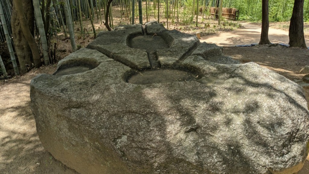 酒船石は長さ5.5メートル、幅2.3メートル、高さ1メートルの一枚岩で、上面には丸型のくぼみとそれを結ぶ溝が掘られています。この形状から、酒を絞る槽、油や薬を作るための道具、庭園の施設などの説があるそうです。
