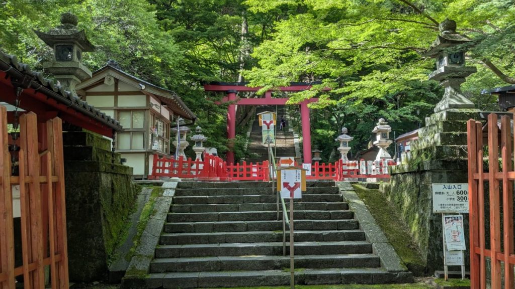 正面奥には140段の石段が見えます。ヒルクライムで痛めつけられた脚には厳しい階段でした。