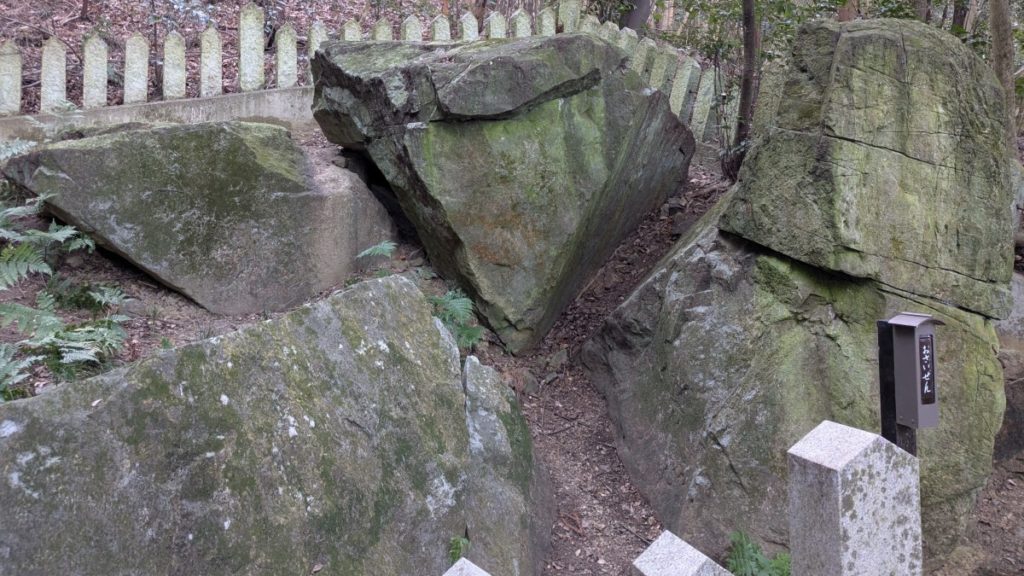 すぐ近くに鎮座する姫石神社には社殿がなく、玉垣に囲まれた大きな4つの岩があるのみです。岩が割れているように見えることから「姫石」と名付けられたのでしょうか。