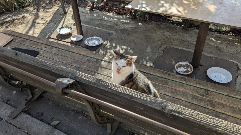 登山会の看板や、祠、茶店がありました。卓球台を置いている茶店まであって、ここで卓球をする人がいるのかと驚きました。また、店番をしている猫にも出会いました。