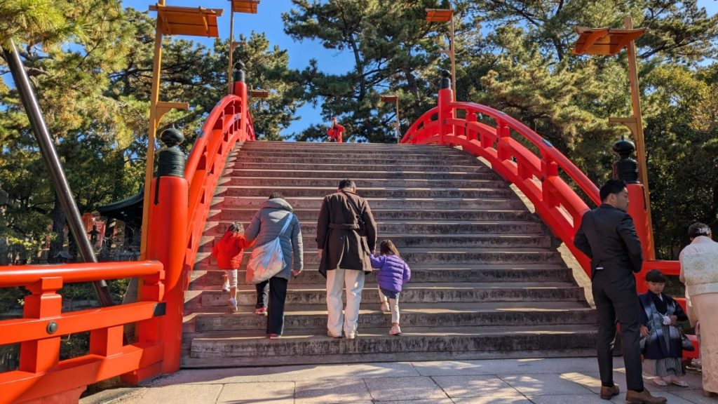 朱色の反橋(そりはし)を渡ります。太鼓橋なのですが、そのカーブ(反り方)はとても急なので、まるで階段です。