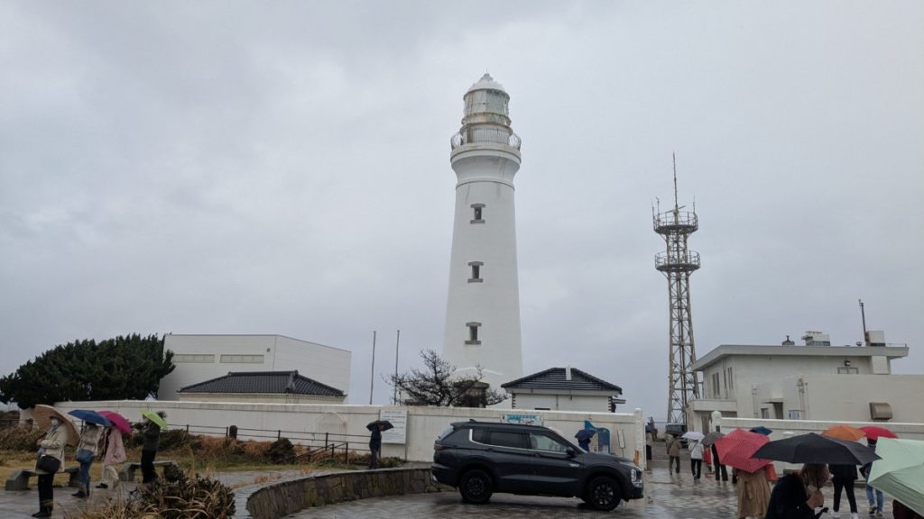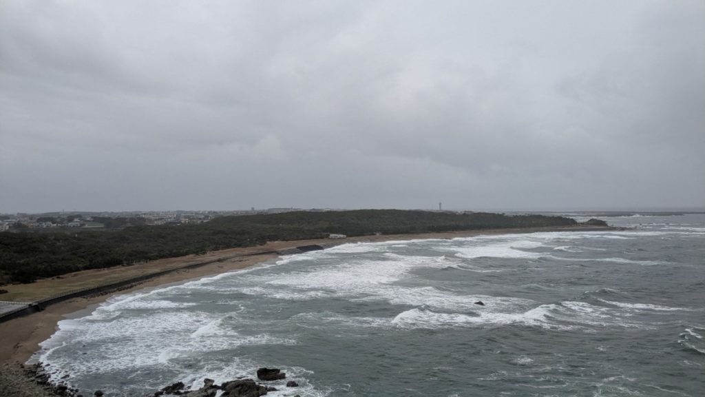訪問した日は雨と強風に見舞われ、君ヶ浜には大きな波が打ち寄せていました。アメダスデータでは銚子の風速は5m/sほどでしたが、灯台の上は遮るものがないため、傘を差すのが危険なほどの強風が吹いていました。