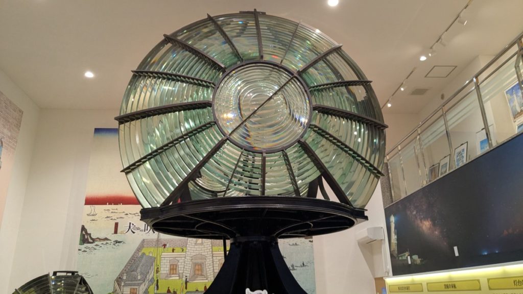 展示されている国産第一号の大型一等レンズは高さ5メートル、重量13トンという大きさで、大正11年(1922年)から平成19年(2007年)まで沖ノ島灯台(福岡県)で使われました。大正時代に作られたレンズが、つい最近まで現役だったことに驚きました。