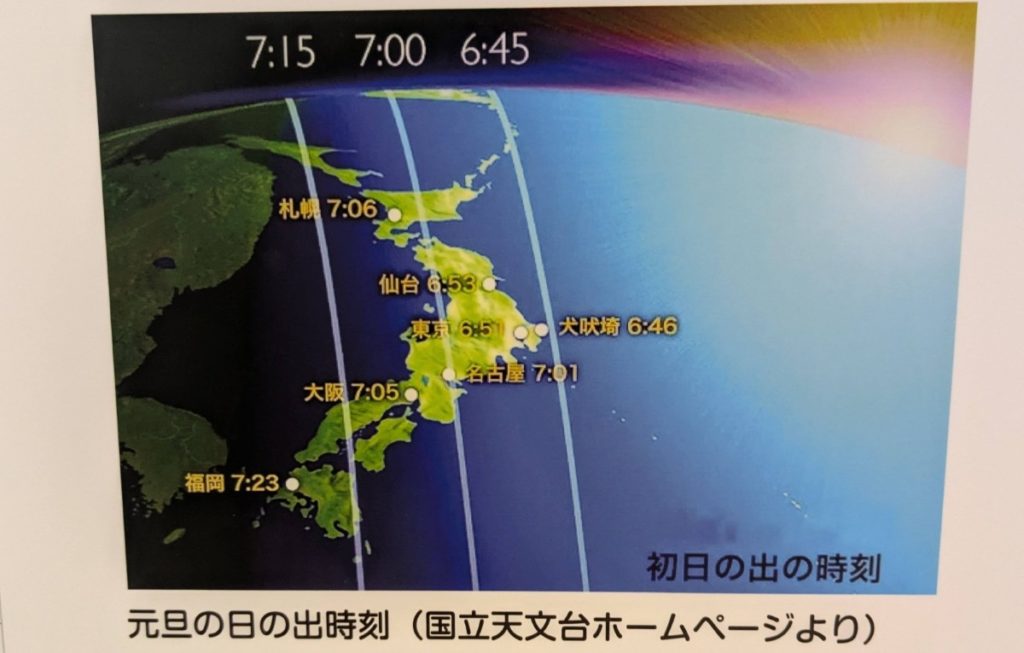 地図では納沙布岬などは犬吠埼灯台より東に位置するので、そちらの方が早い初日の出になるのかと思っていたのですが、地軸の傾きの影響で、元旦前後は犬吠埼が最も早い初日の出(6時46分)を迎えるそうです。