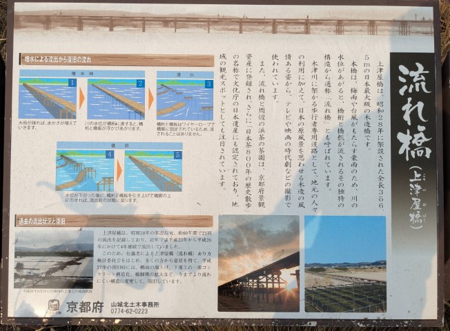 橋のたもとの看板に、流れ橋の仕組みが説明されていました。