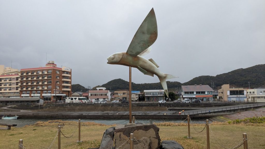 すると、トビウオのモニュメントが現れます。「かっとびくん」といい、21世紀へ大きく羽ばたく(かっとぶ)という願いを込めて作られたそうです。
